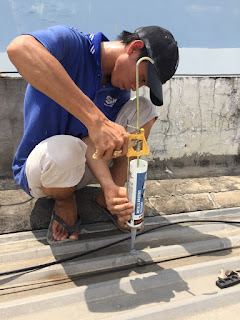 Sau đó thi công chống dột bằng các sản phẩm như : keo chống dột mái tôn mc-201 , hoặc đối với những mái tôn cũ có nhiều lỗ nhỏ hoặc tiếp giáp giữa hai mí tôn do khi lắp ghép chồng mái tôn quá ít cần sử dụng băng keo chống dột BT-330 để dán đè lên, đối với lớp tiếp giáp giữa tôn và tường thì